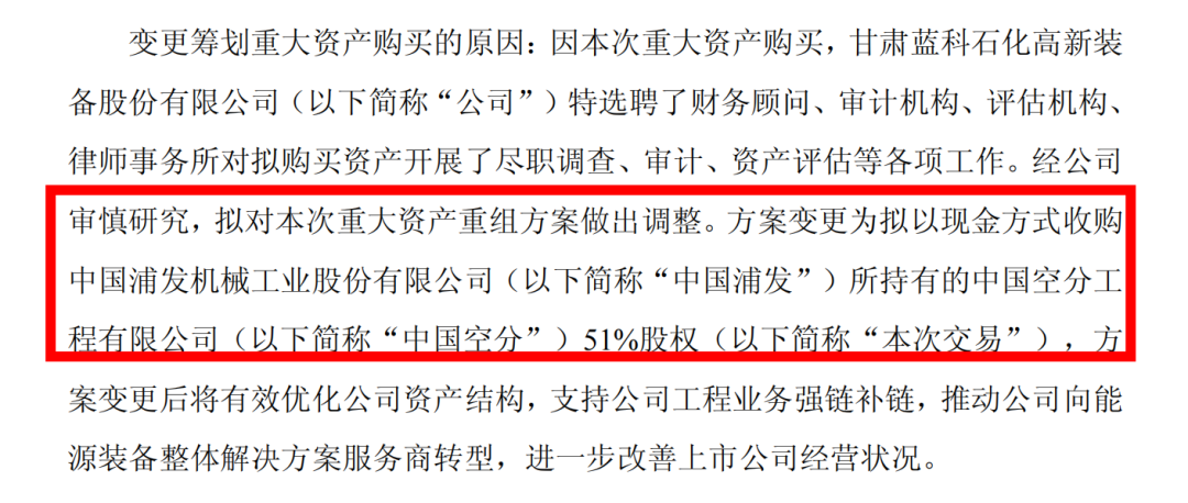 公司10月31日披露的交易方案显示,蓝科高新将只购买中国空分51%股权,而不再购买蓝亚检测100%股权。