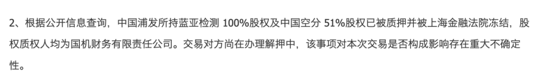 进一步探究可知,交易变更或许与交易标的的股权质押有关。据公告,中国浦发所持蓝亚检测100%股权及中国空分51%股权已被质押,并被上海金融法院冻结,股权质权人均为国机财务有限责任公司。